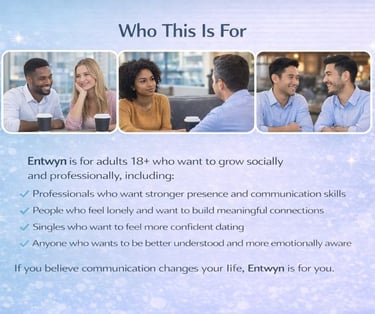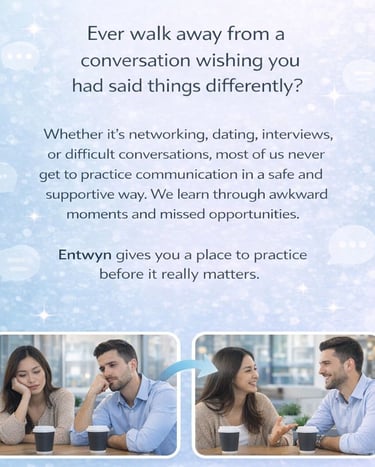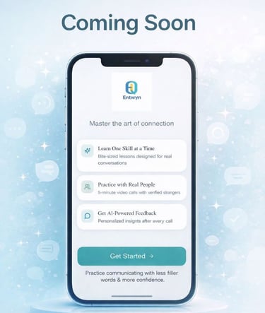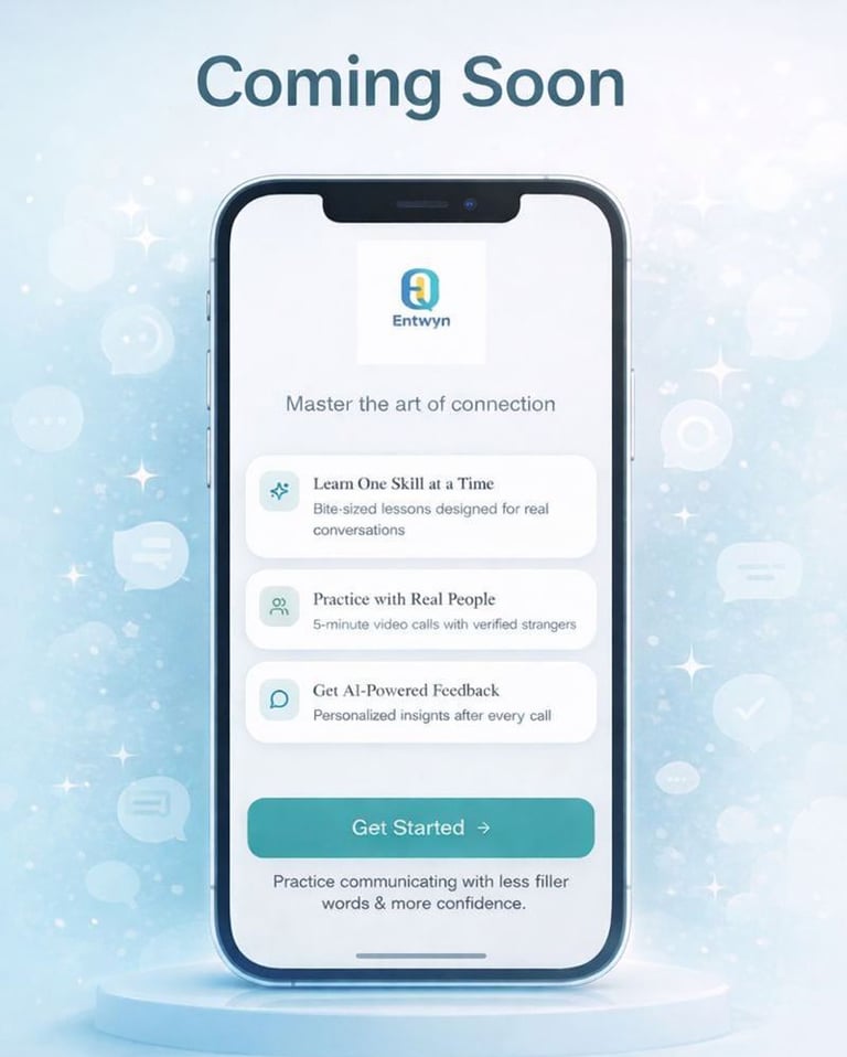 Entwyn helps you improve how you communicate through short lessons and live practice with AI and real people, giving you feedback and insights to your own patterns. Designed for professionals and socially curious adults who want better conversations, deeper connections, and more confidence in any situation.