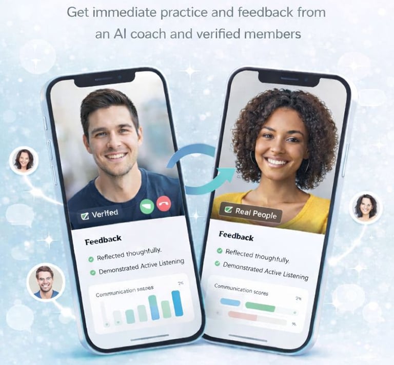 Do quick reps with AI anytime, or join guided conversations with real verified members.